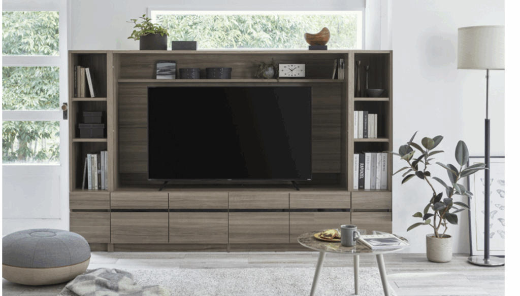 テレビスペースや本棚、ディスプレイ棚を組み合わせれば、収納力とデザイン性を兼ね備えたスッキリ空間に。